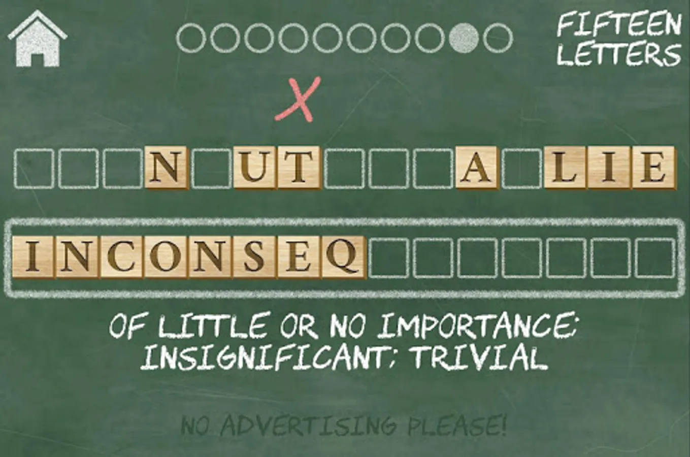 Rearrange the letter tiles to form a word that matches the clue (much like a jumble, scramble, or anagram word game). You start off with four-letter words, and as you progress, you can work your way up to 15-letter words! The game includes over 4,000 of the most frequently used English words. It's a great way to improve your spelling and vocabulary with support for both British and American English.