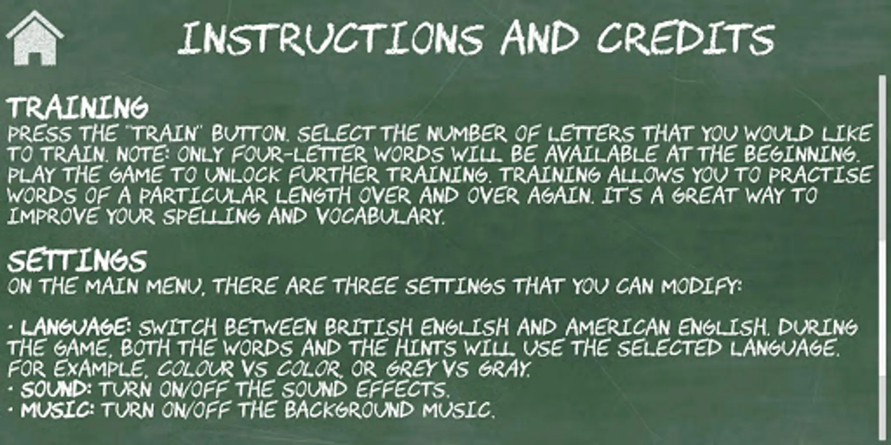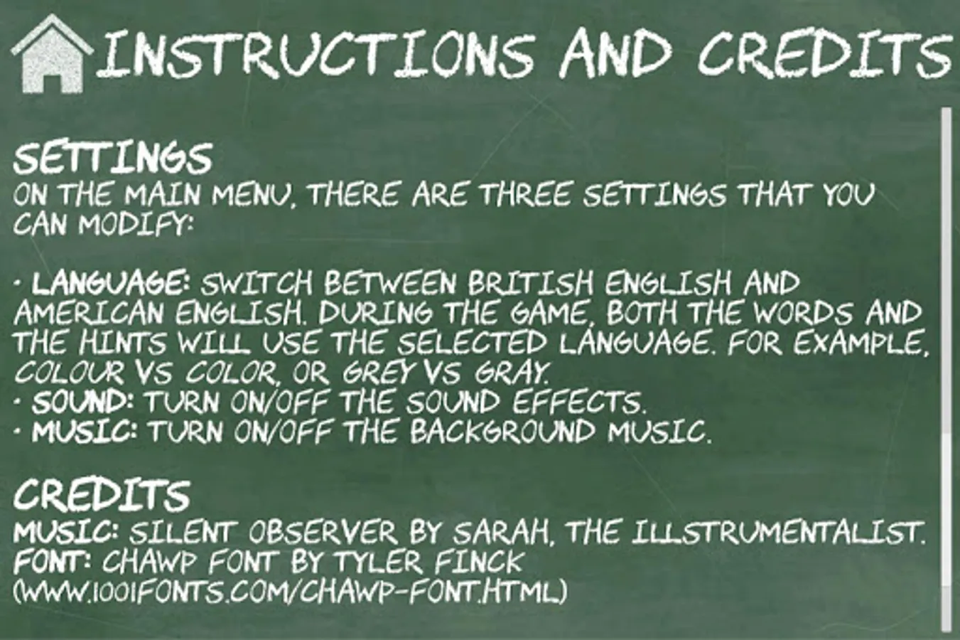 • Language: Switch between British English and American English. During the game, both the words and the hints will use the selected language. For example, COLOUR vs COLOR, or GREY vs GRAY.