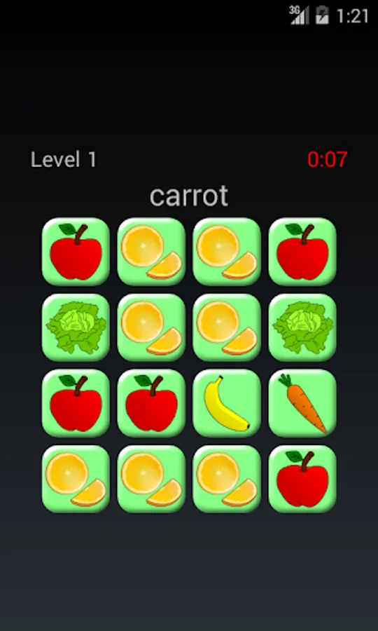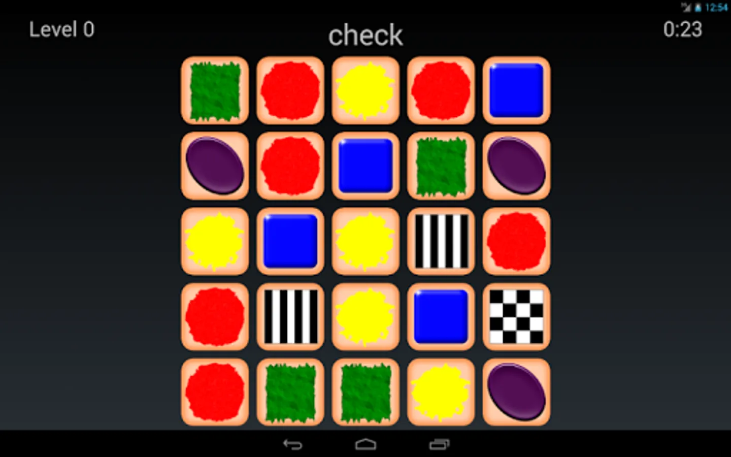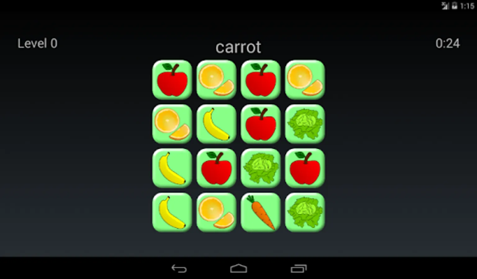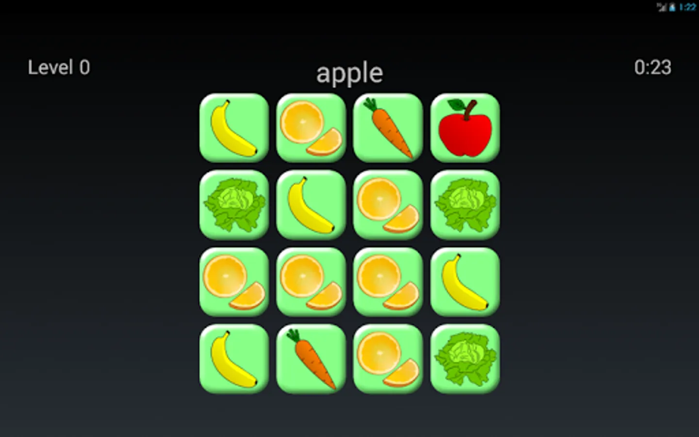 • Four difficulty levels: Easy, Medium, Hard and Extreme. As the game progresses, more words/pictures are exposed to aid learning. Example shapes include: hexagon, semi-circle, cube and hemisphere. Example colours and patterns include: lavender, olive, houndstooth and argyle. Example fruits and vegetables include: mandarin, sweet potato, pomegranate and cabbage.