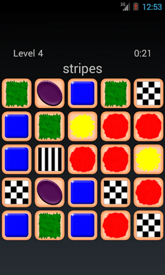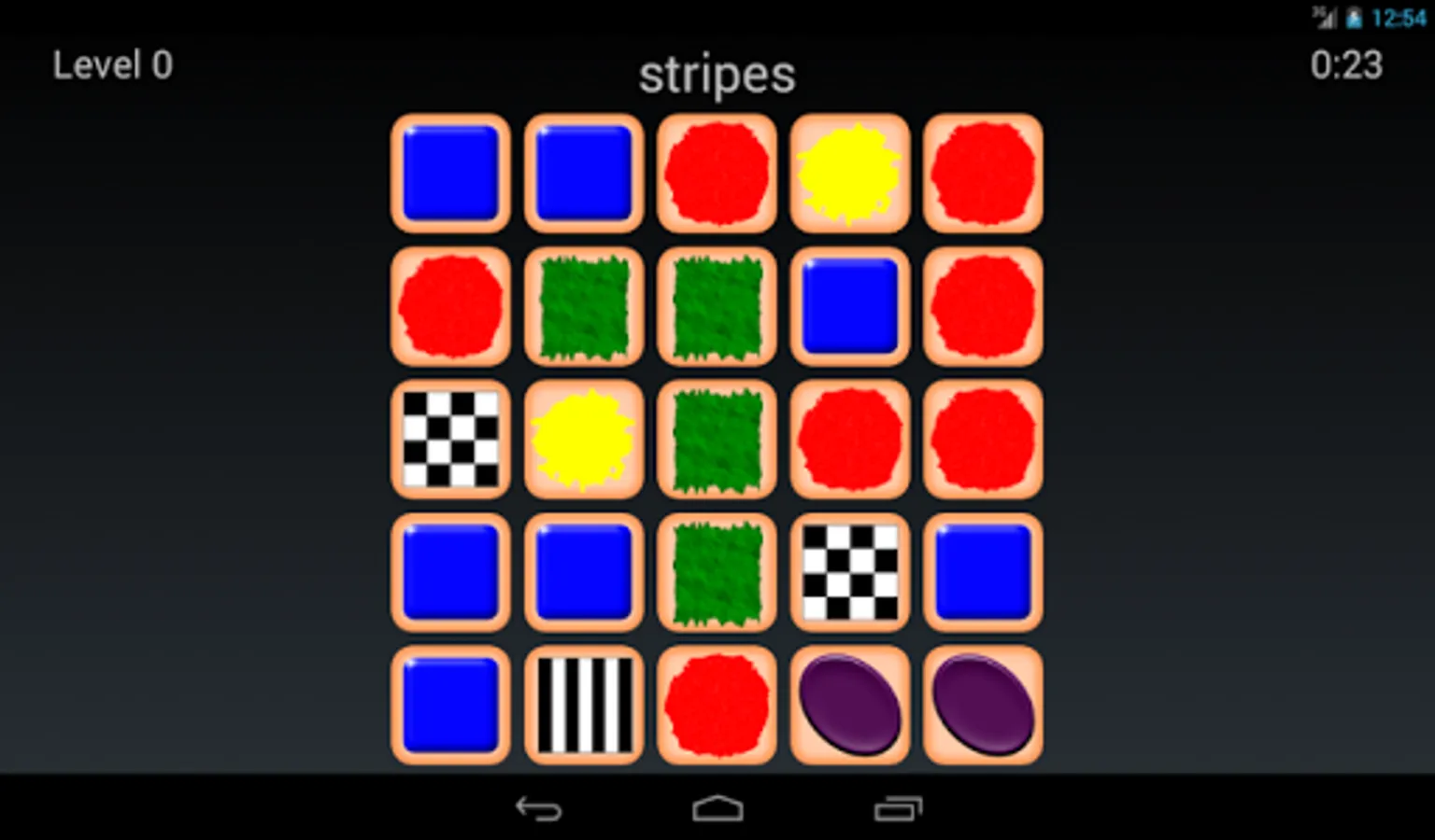 The goal of this game is to hear/read a word and touch the appropriate picture from the selected category. E.g. touch the circle, rectangle, or cylinder; touch the colour blue, green, or gold; touch the brick pattern, the stripe pattern, or the camouflage pattern; touch the apple, lemon, or potato, and lots more!