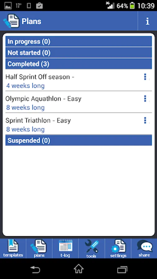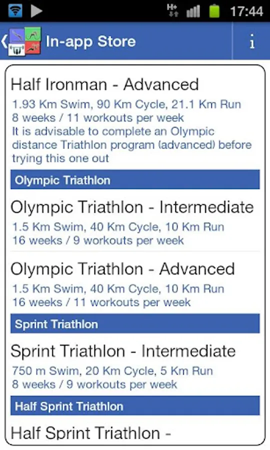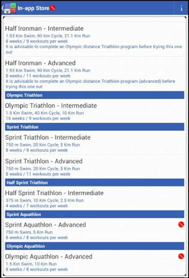 The following training programs are free: Half Sprint Triathlon (Easy), Half Sprint Off season (Easy), Sprint Triathlon (Easy), Sprint Duathlon (Easy) and Sprint Aquathlon (Easy). Also the following tools are free: Heart rate zones calculator, plan exporter, weight and sleeping hour tracker, running shoes tracker and backup/import. The rest can be bought via in-app purchases.