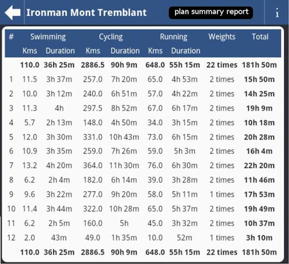 Fully customizable triathlon training plans. After creating plans from templates, you will be able to add, delete, copy and move training activities within a training week. What is more, you can generate plan summary reports and email your on-going plans. What's more, you could export your training plan for a given day to your calendar.