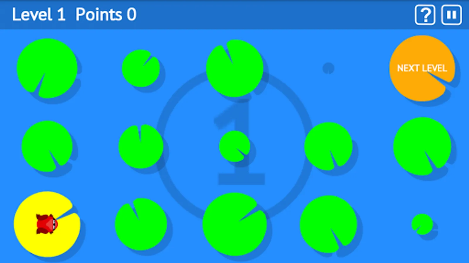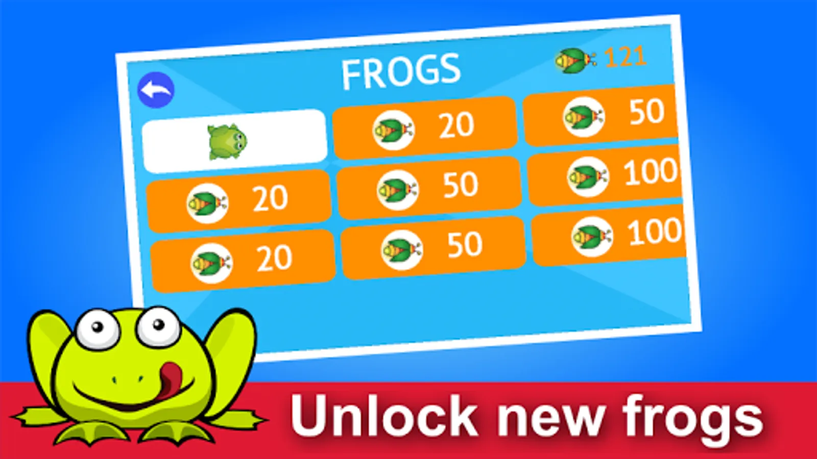 Only jump straight, jump diagonally and you die. Eat flies to collect points. Use your points to unlock new beautiful and colourful frogs.