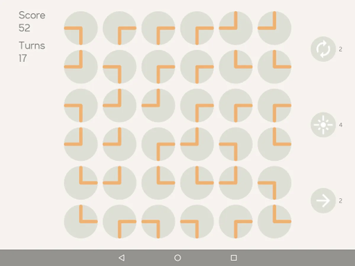 • Use the action buttons to shift a row to the right; remove a circle from the board or spin all circles not already part of a half square.