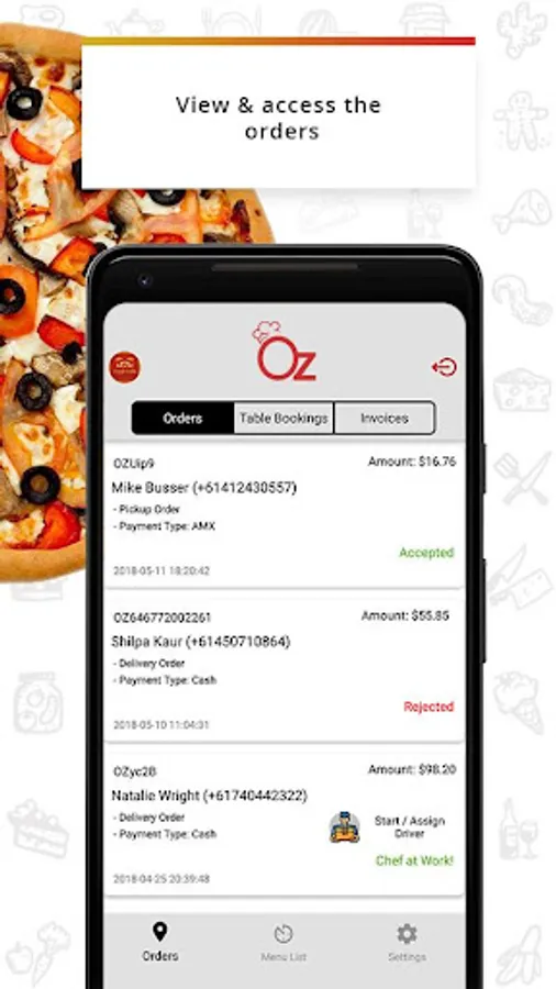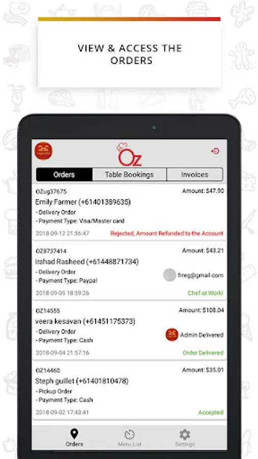 • Access the order details, accept and cancel the orders (Request to OZ)