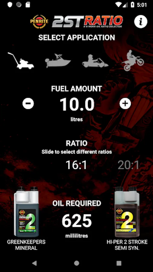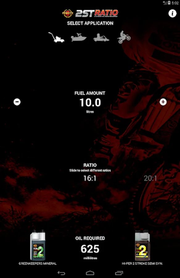 A simple app to calculate 2 stroke oil requirements for different ratios and applications.