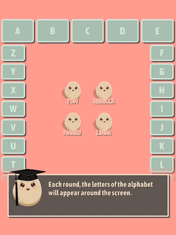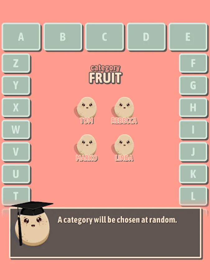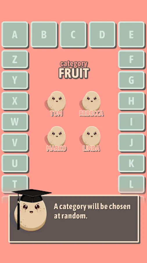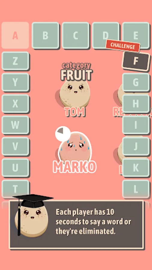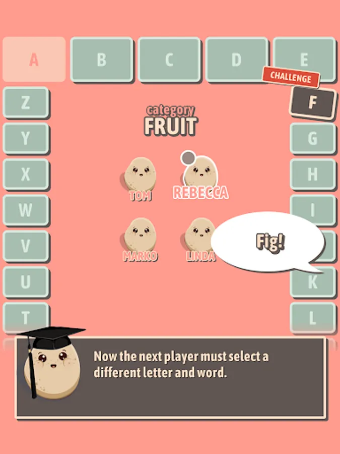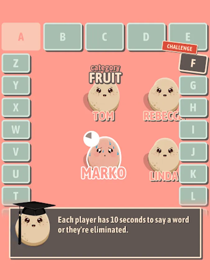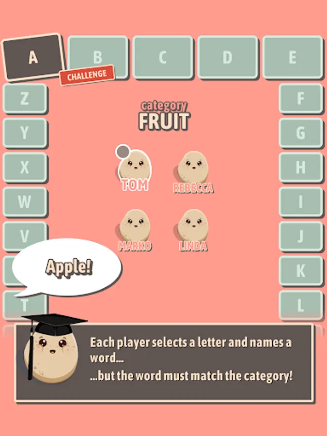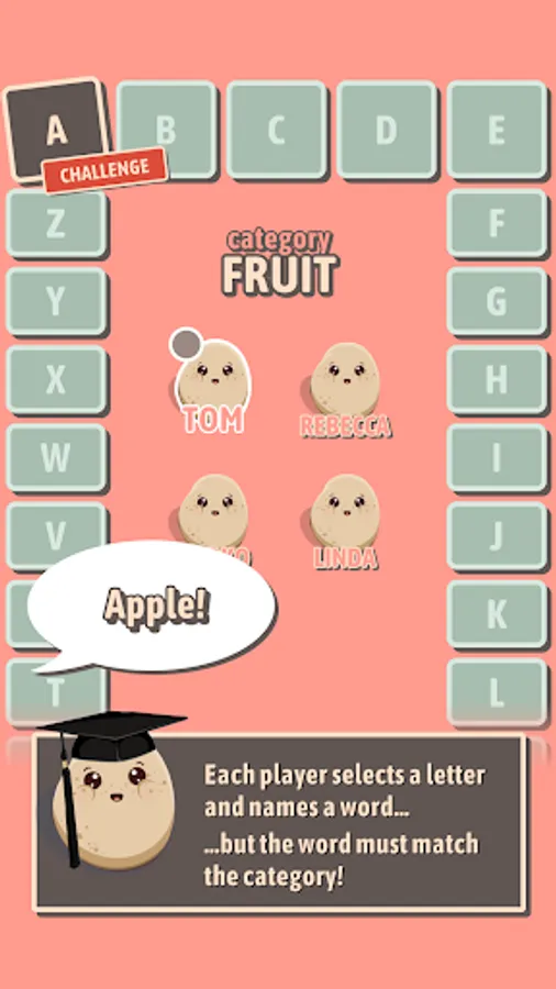 Select a letter, name a word that starts with that letter. Be careful though – if the word doesn't match the category provided, you'll be out!