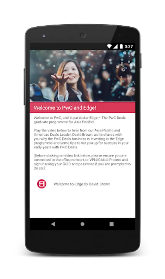 The PwC Edge app is your gateway to all things Edge. The app keeps you informed and connected about your Edge journey, Edge community, Edge news and so much more. Stay on top on what's coming up and the to-do's as you progress along your Edge journey through the app.
