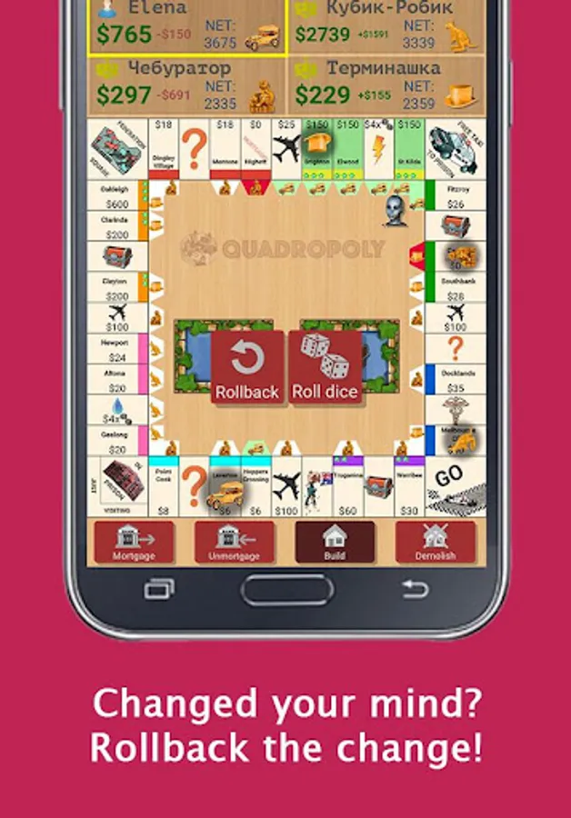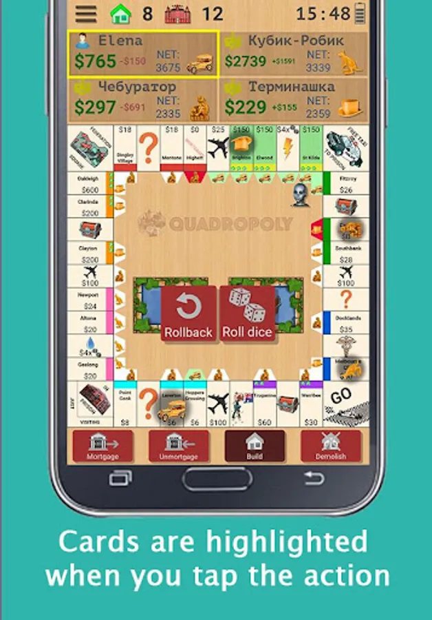 Unlike human opponent, AIs are infinitely patient, make their turn as fast as you tell them and never quit the game when you start winning. Additionally, with AI advice system in Quadropoly you can rapidly improve your own skills in any Business Trading game, learn the real value of the properties, cashflow management and money, improve your negotiation skills, and, most importantly, avoid throwing (or dodging) game pieces at your opponents face