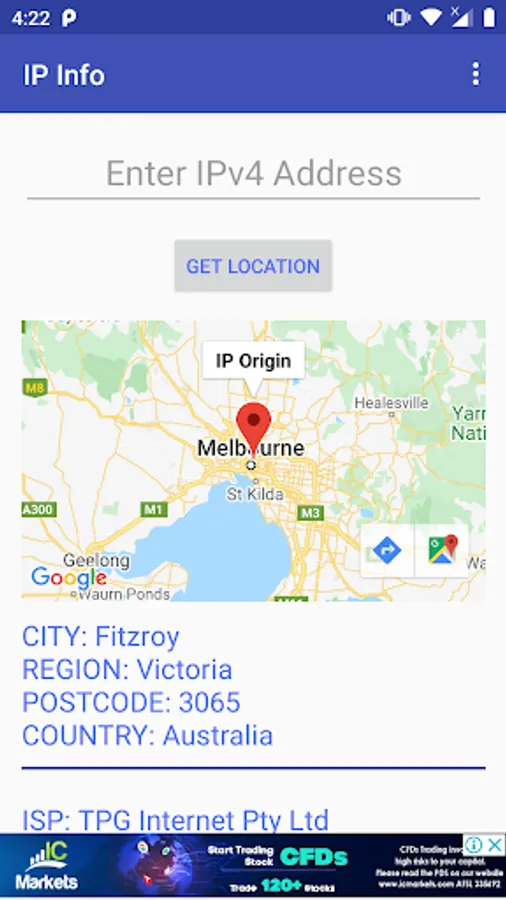 Get detailed information about the physical location of an IPv4 address including the city, postcode and its latitude and longitude