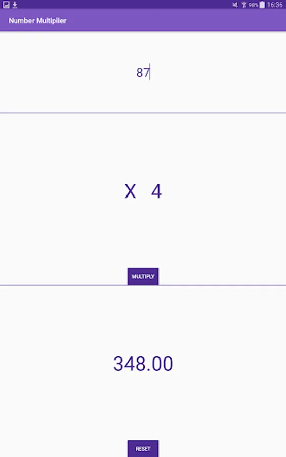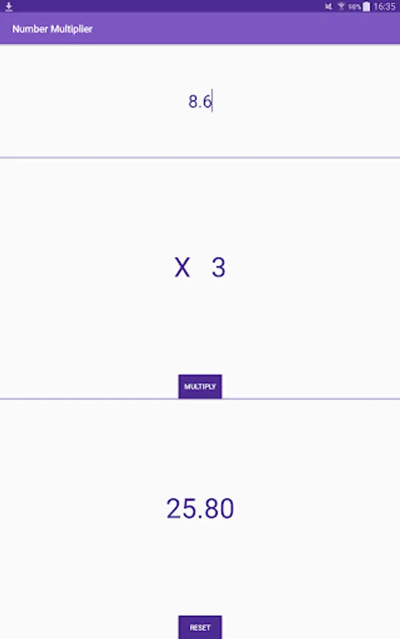 Never got down to memorising the multiplication tables. No fear! Here's a handy app to multiply numbers both with and without decimal places or in other words integers and floats. The answer is rounded down to 2 decimal places. Just enter any number using the popup keypad and tap the "MULTIPLY" button to get started. Tap the Reset button or just delete the existing number to start from scratch again.