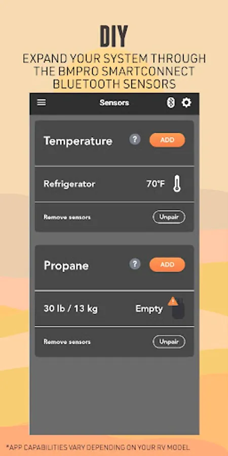 BMPRO Connect on board your RV is flexible and scalable – it is easy to add features and sensors to expand your system through the addition of SmartConnect Bluetooth sensors. Available through RV Dealerships, SmartConnect sensors enable you to monitor propane levels, tire pressure and internal temperatures. The SmartConnect sensors are a DIY installation.