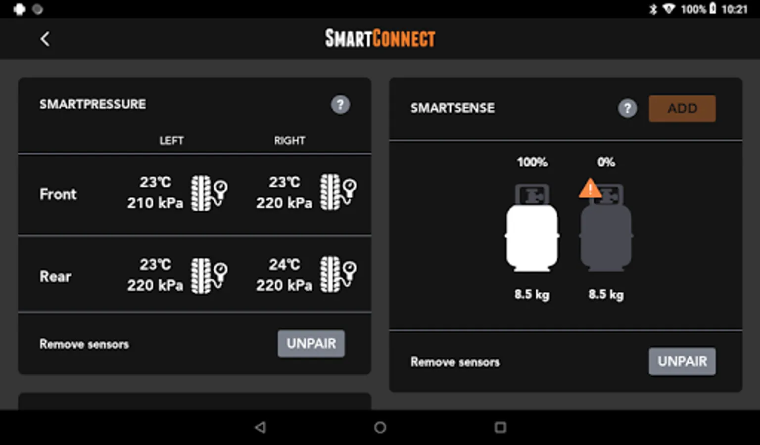 Get detailed views of your current power source (solar, auxiliary, or mains). Check consumption indicators (output voltage, output amps, and battery amps) and your Battery’s State of Charge, to get a complete view of your power system’s time remaining. Better manage appliances in your van for longer battery life.