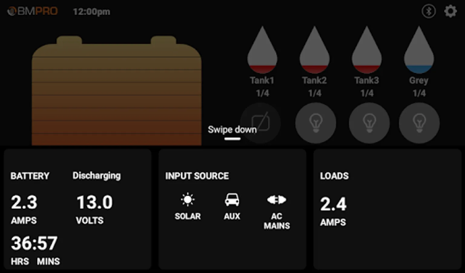 - Provides full visibility and control of the caravan’s battery system including battery status, power consumption and available charge sources