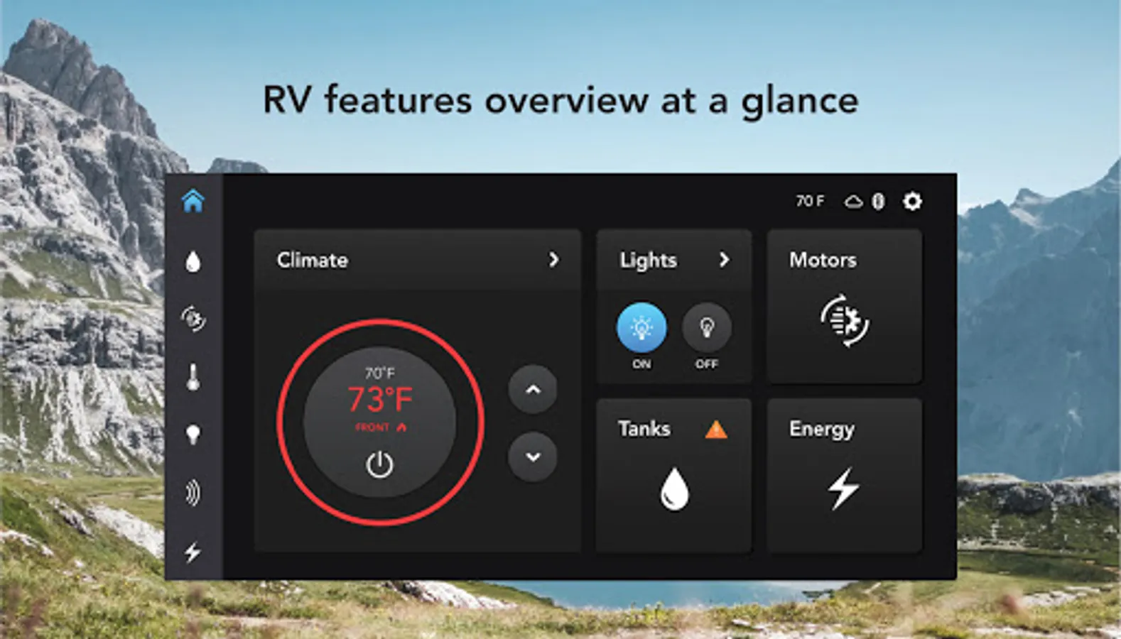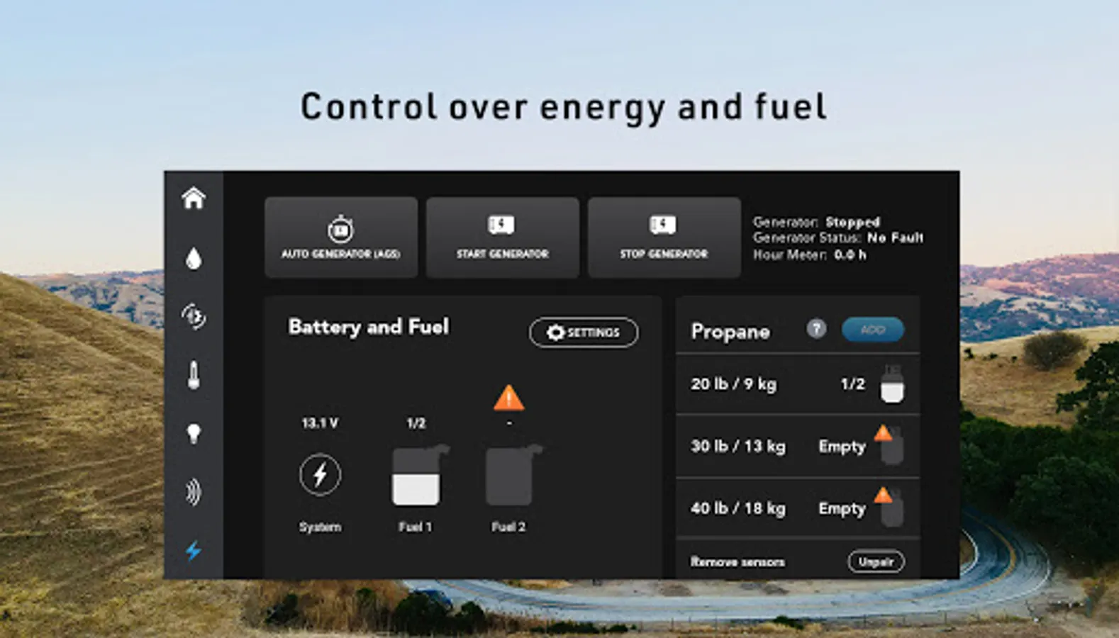 • Monitor - water tanks, temperatures, propane levels, tire pressure, battery voltages and more