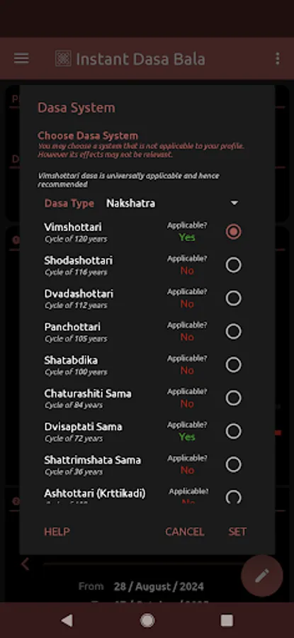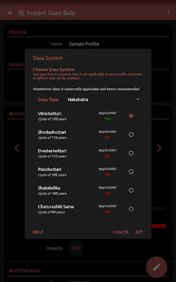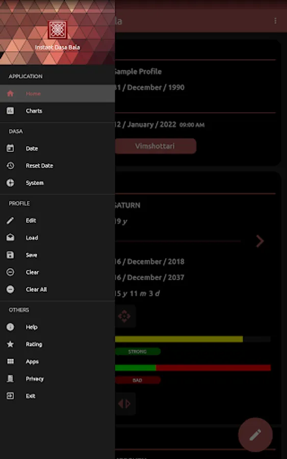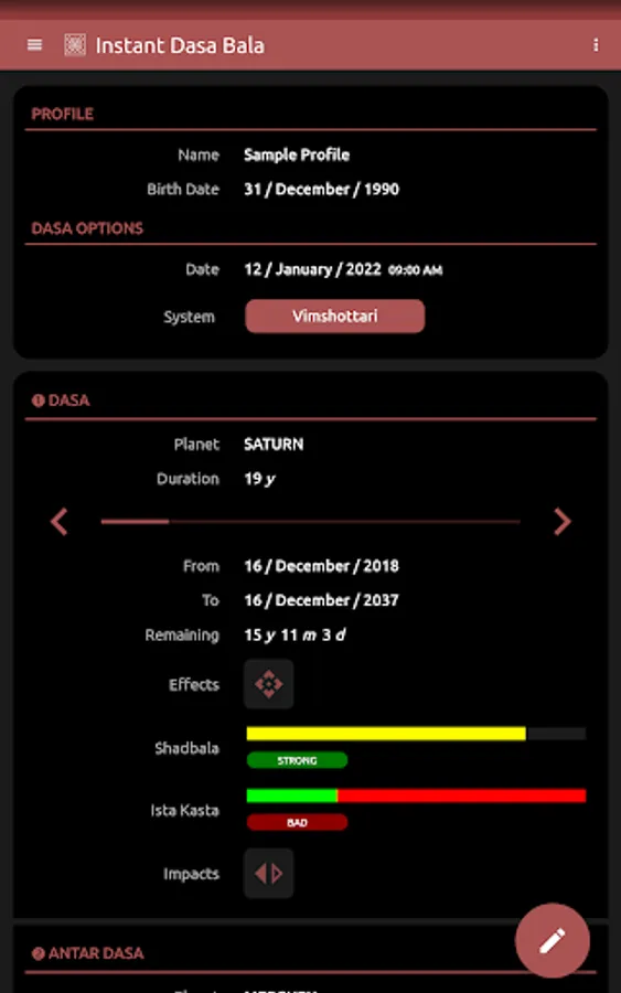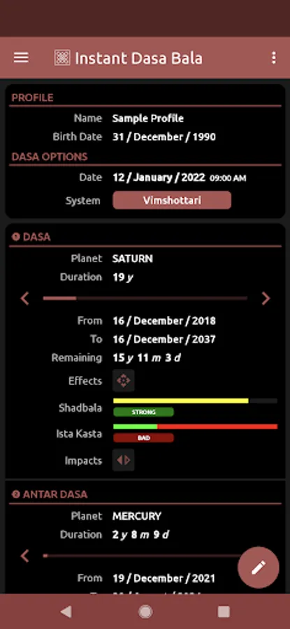 * Displays the duration of the dasa/sub-dasa periods, the progress as well as the balance remaining. With the planetary strength and nature displayed side by side, it gives you an easy and quick way of assessing your current astrological state. The app automatically calculates and displays the special dasa systems applicable to your profile!