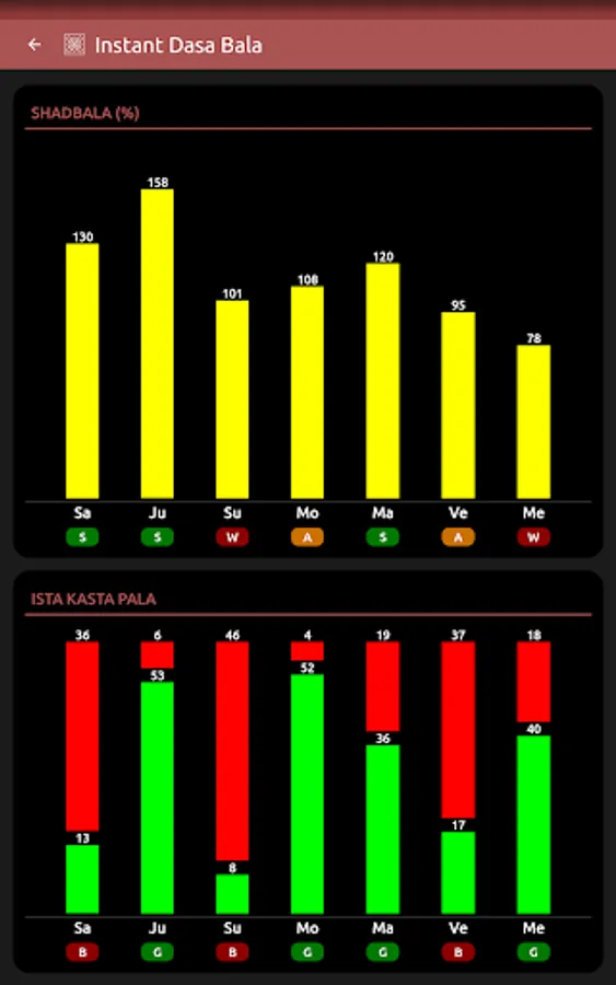* Displays the current and future/past Dasas ruling ones horoscope along with the Shadbala (strength) of the planet(s) ruling as well as the proportion of Ista/Kasta pala (Favorable/Unfavorable) effects of these planets.