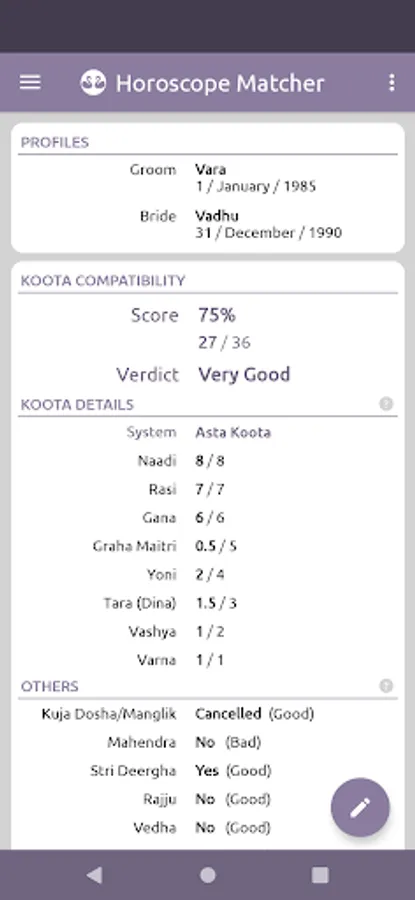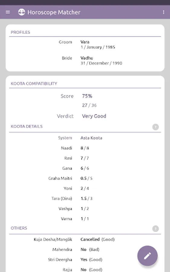 Each koota is assigned certain points and then totalled. A score of 18 or above is considered as good while anything less is considered unfavorable for marriage.