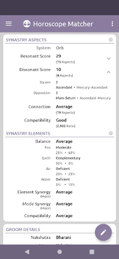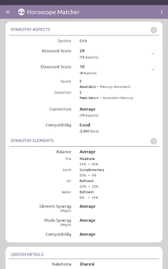 * Provides details on synastry element and mode compatibility. Balance between various elements such as Fire, Earth, Water etc. are analyzed and its compatibility evaluated.