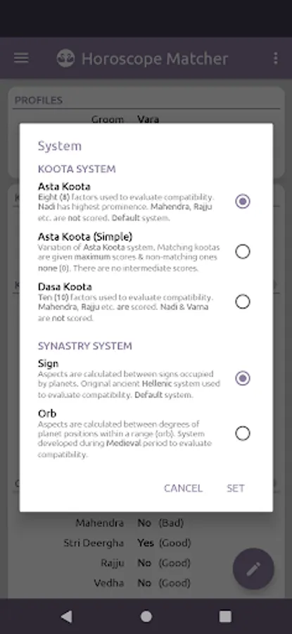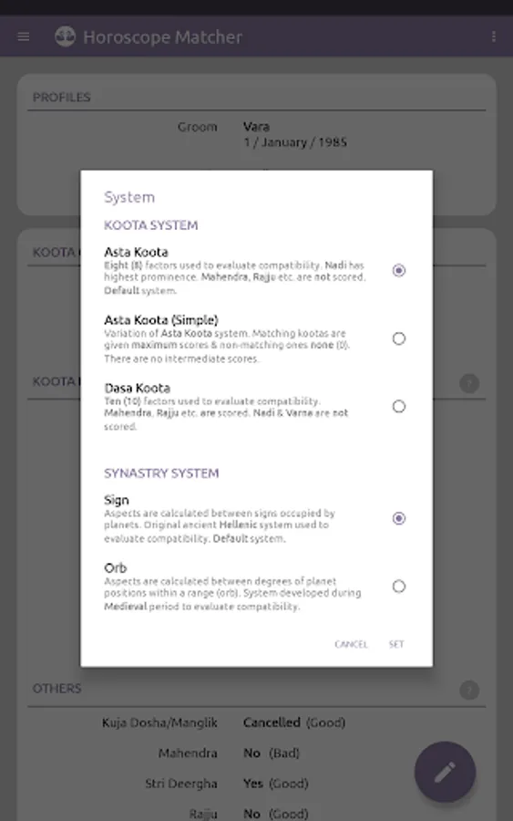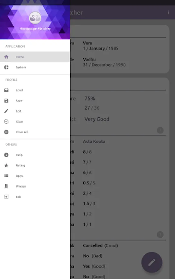 * Implements Asta (8) and Dasa (10) Koota system of matchmaking, a method for partnership matching in vedic astrology that is based on the analysis of the zodiac position of the Moon for the couple in question.