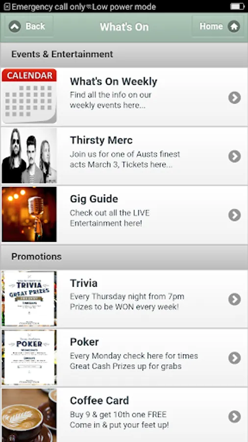 Day to day activities, Featured events, LIVE entertainment, Weekly performing artists, Dining menus, Daily specials and it notifies you on all special events. It provides you with all the venue’s information & news at your finger tips & more