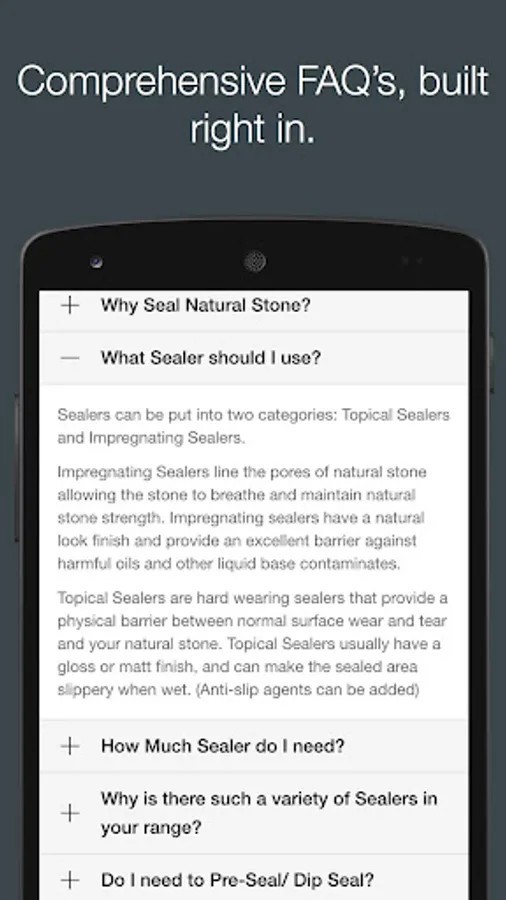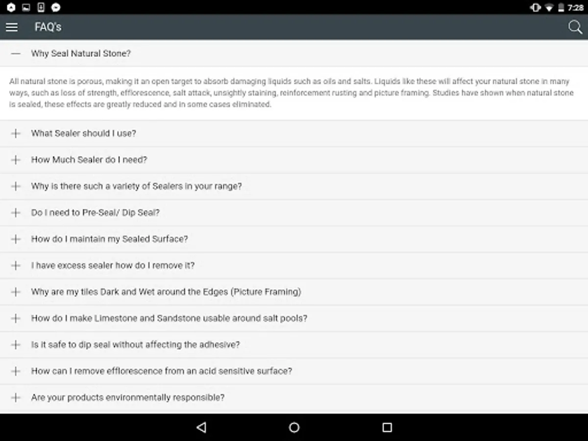 This app highlights many FAQ’s and provides you with further sealer information, a how to clean guide and a coverage estimator to confirm the required sealer needed for your surface type.
