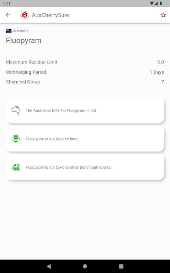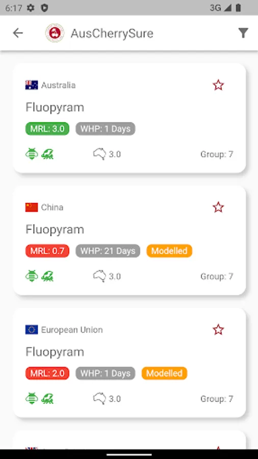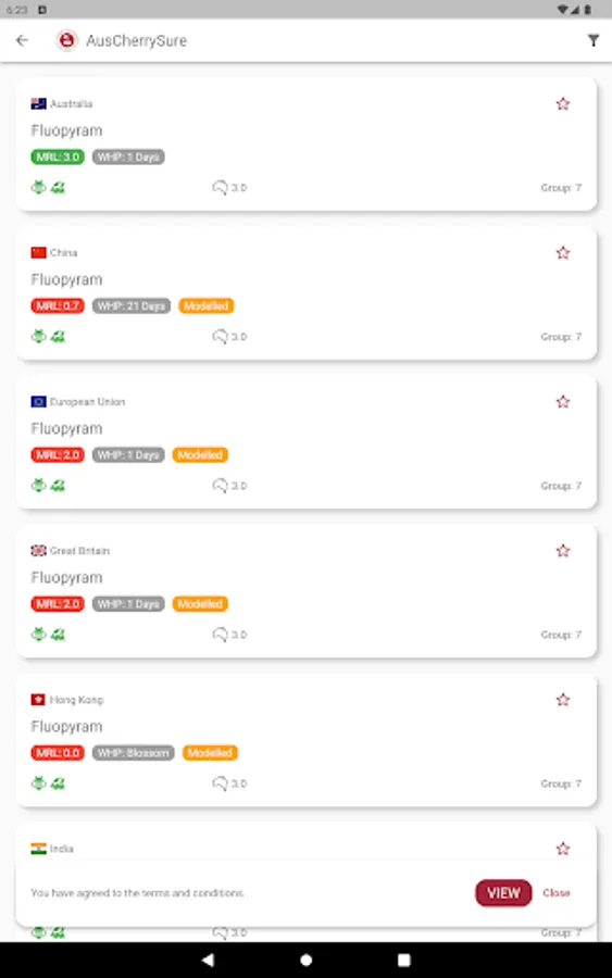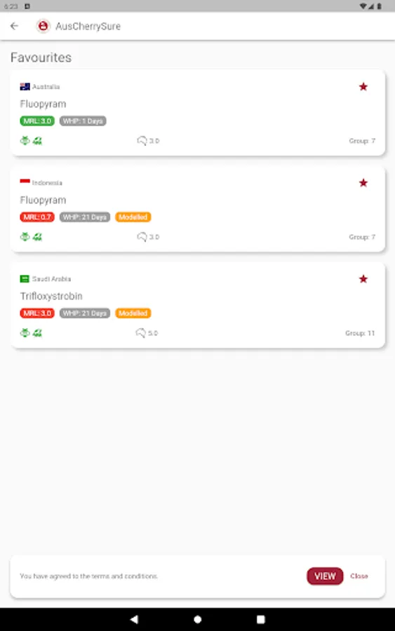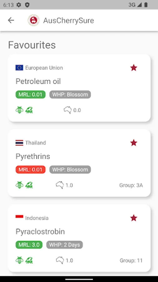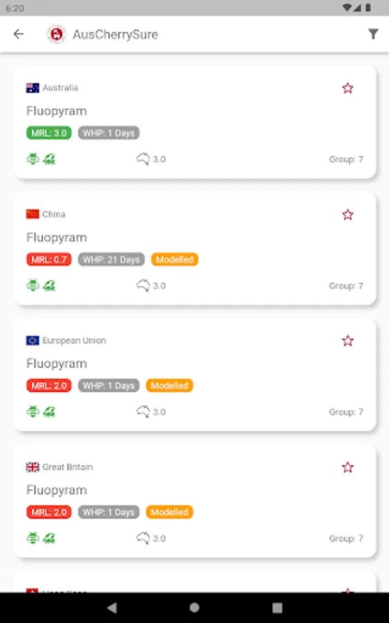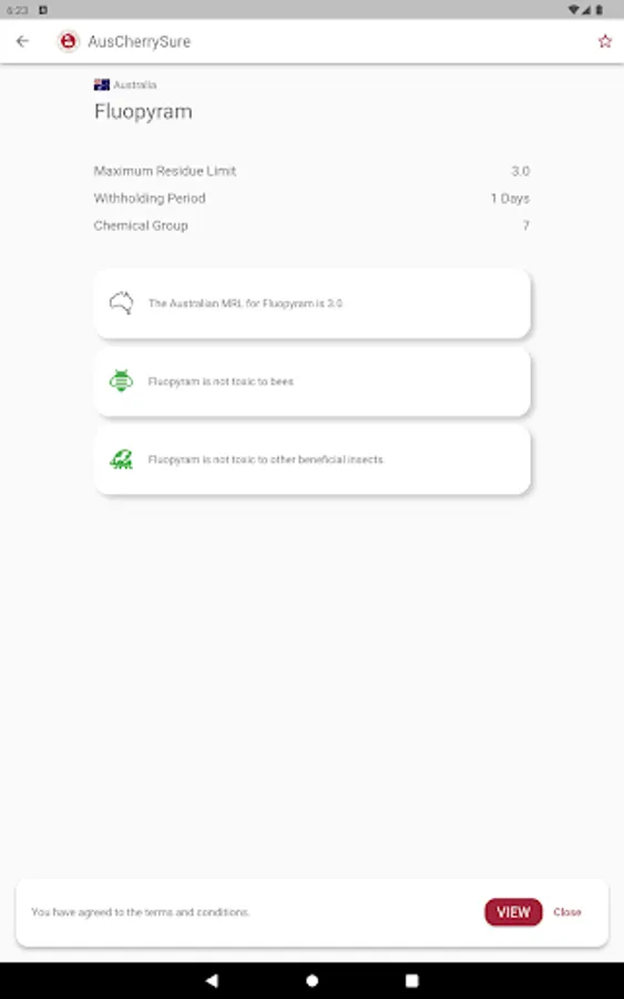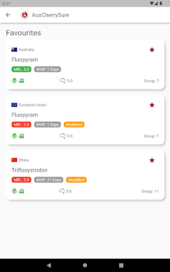 AusCherrySure is a reference for viewing maximum residue limits (MRLs) and suggested witholding periods (WHPs) for various pesticides, herbicides, and other chemicals, when exporting cherry crops from Australia to overseas markets.