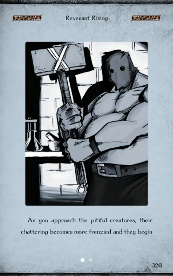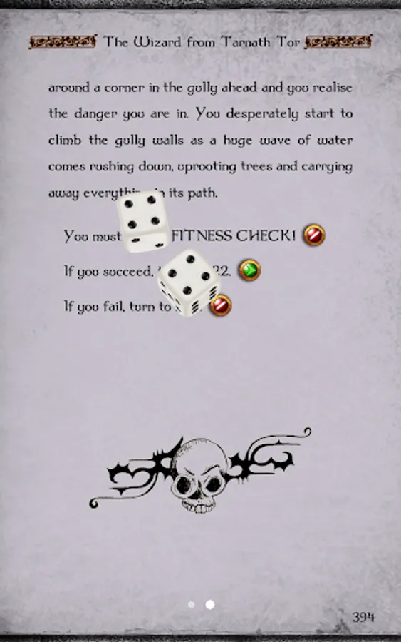 Occasionally you will be presented with a situation that needs to be resolved with some dice rolling. The gamebook engine lets you throw 3D physics based dice that roll and bounce as if you were tossing them on a tabletop. Roll the dice to resolve combat by pitting your character against a myriad of enemies. Roll the dice to see if you were able to leap the gaping chasm, or pick the shopkeep’s pockets. Roll the dice to see if you won a bet, or caught the plague!