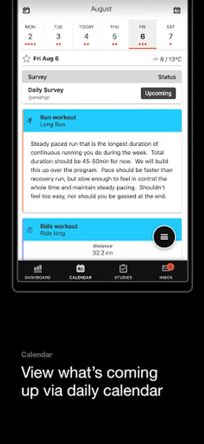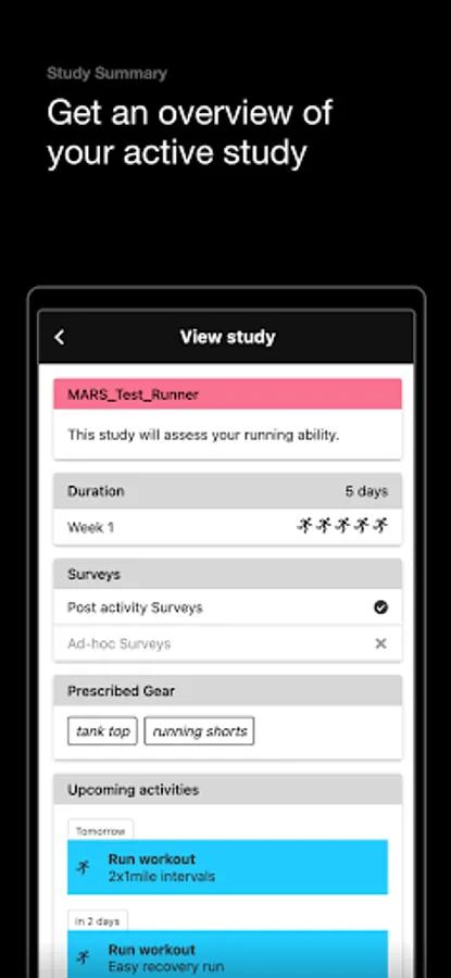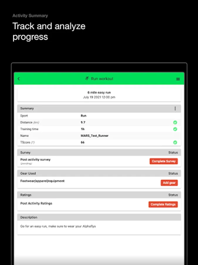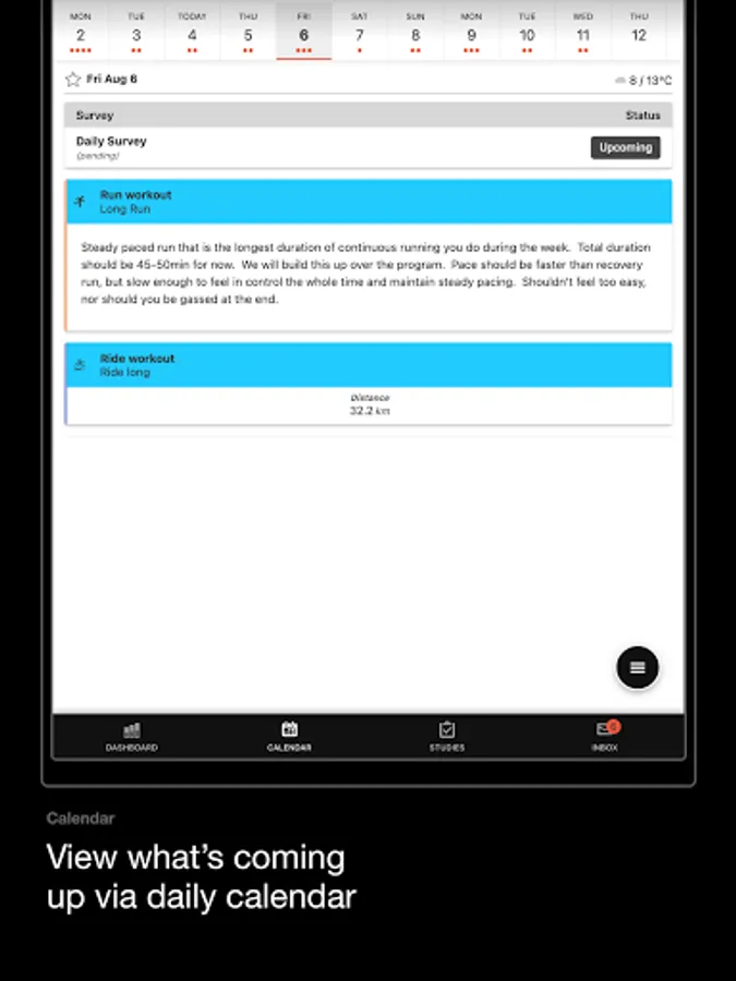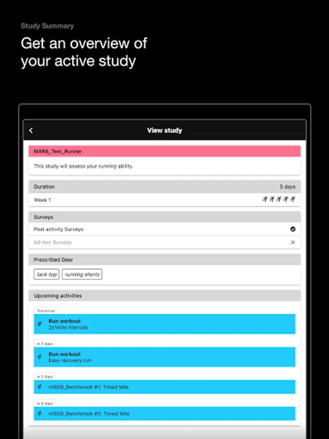 The M.A.R.S. app allows athletes to record, track and provide feedback on activities. Easily navigate the calendar to see upcoming workouts, review key performance metrics from completed workouts, and provide details/feedback to researchers.