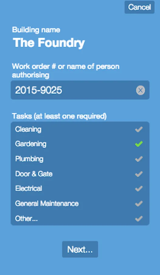 This app allows building maintenance contractors to check in on arrival at site, verify compliance with safety and procedural requirements, and check out on completion of the task.