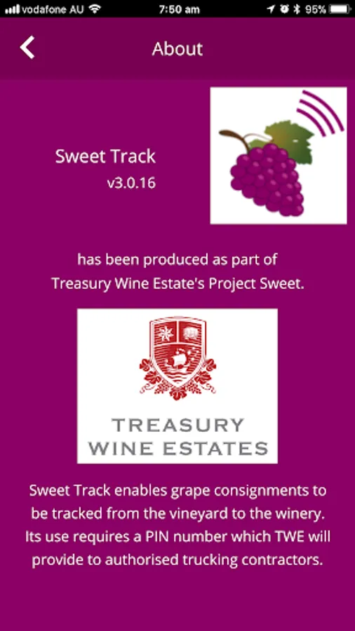 This app enables grape transportation bookings to be tracked from vineyard to winery, reporting location and time along the way to support Treasury Wine Estate's harvest logistics. The App requires a PIN number which can be obtained by transport contractors from TWE.