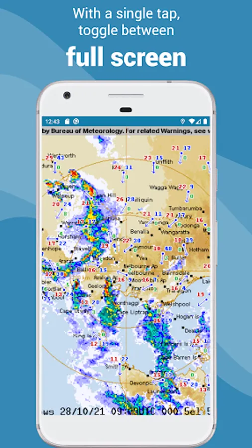 Displays animated radar images full screen, single tap to show or hide all associated controls.
