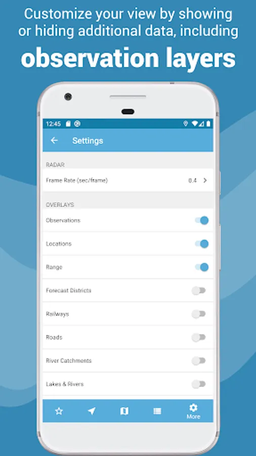 At start up choose to display the last radar viewed, your favourite radar, or the closest radar. No tapping, just get the radar you want to display instantaneously.