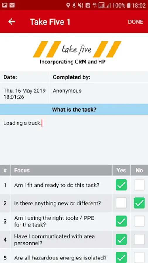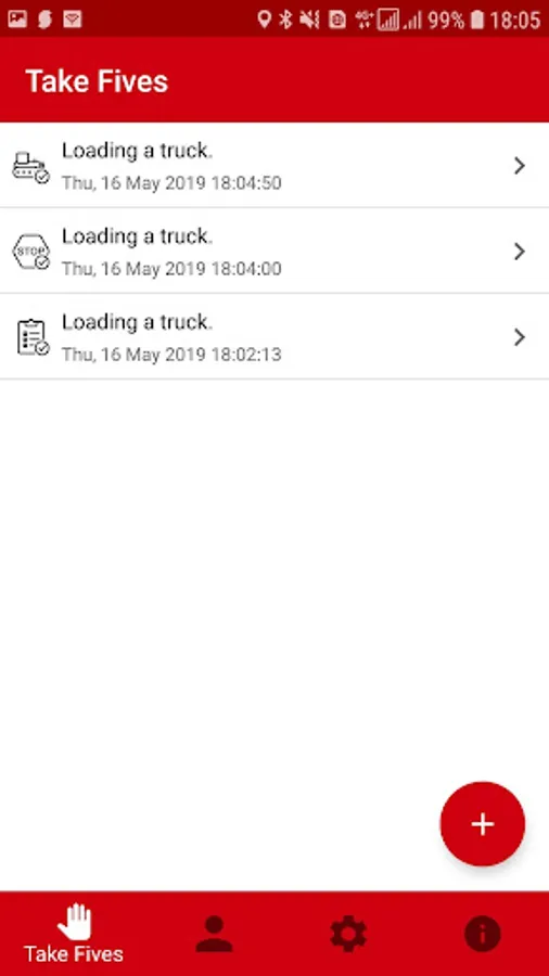 The mobile app allows the user to complete a ‘take five’ and have it uploaded to the cloud. It also automatically downloads any new content, such as new or updated ‘take five’ forms, based on configuration changes made in the dashboard app by an administrator.