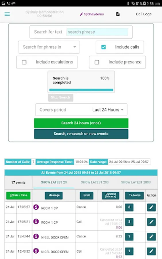 • Call Logs: search for full details of all call/cancel events in a given time period