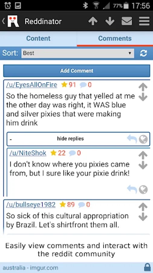 • Reddinator View combines the items content, Reddit comments page and voting buttons into a tabbed layout. Read the article and participate in Reddits great community discussion at the same time!