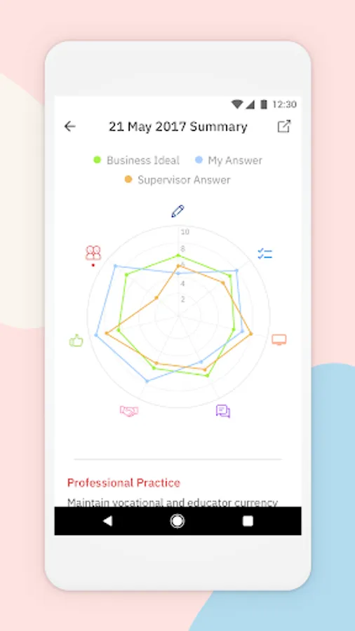 Using the profiling tool, educators undertake a self-evaluation of their individual skills against the business ideals for each capability statement. This information is coupled with supervisory benchmarking to provide a graphically driven dashboard for each educator, displaying current skills and supervisor feedback compared with the desired business ideal.