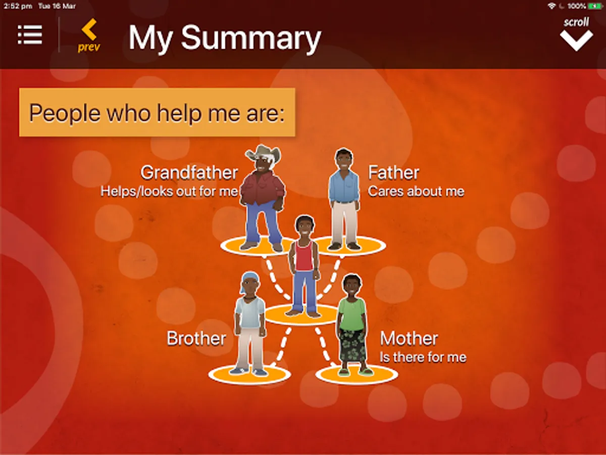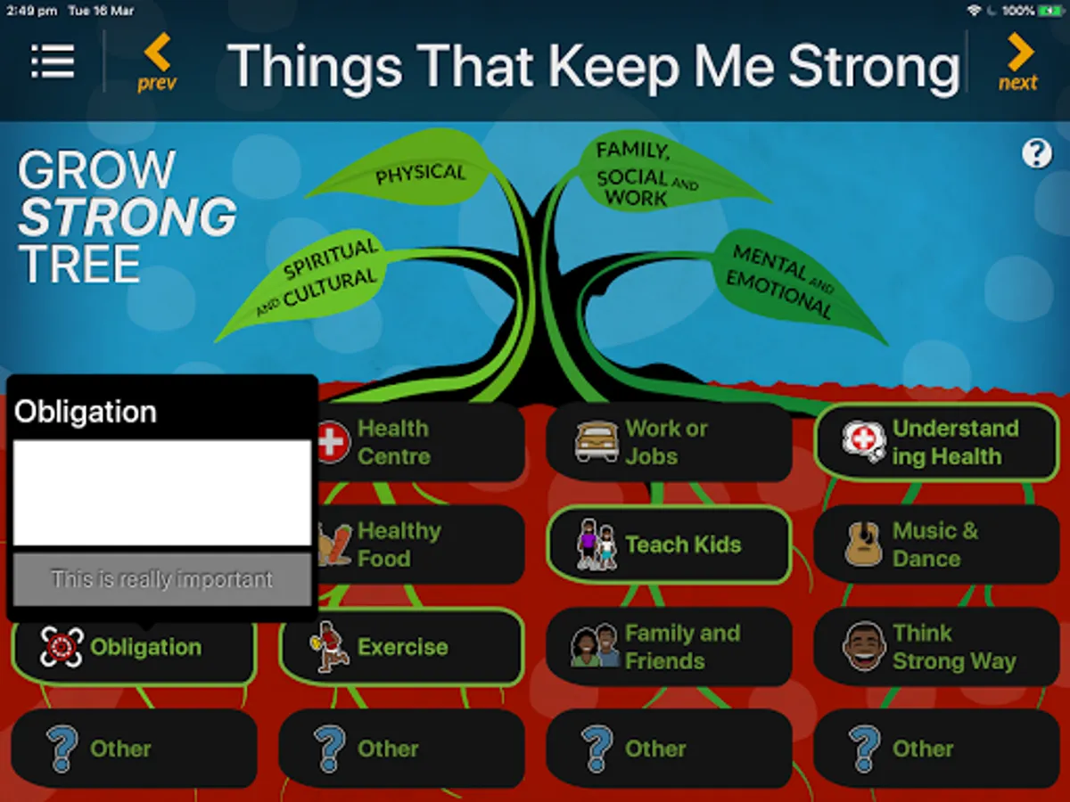 Next, the client discusses things that keep them strong, using the metaphor of a tree. Spiritual, physical, work, family and emotional strengths are explored. As the client selects a strength there is a concurrent growth in the size of the relevant leaf. Strengths can be personalised by adding text.