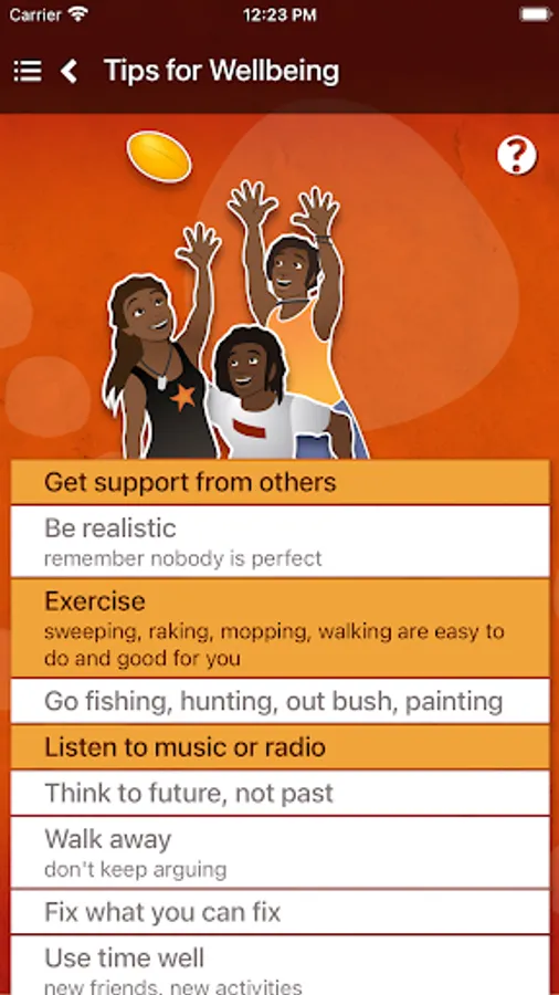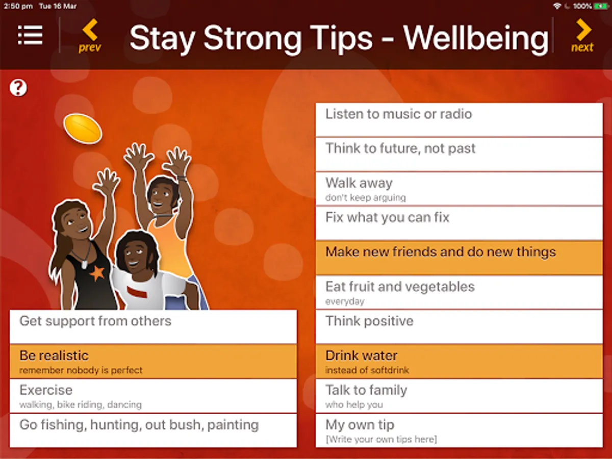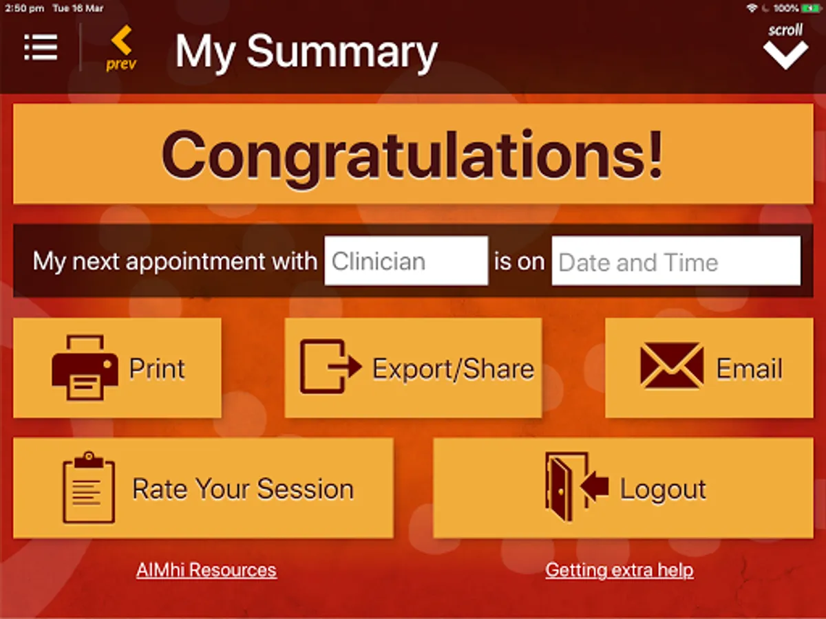 Using the metaphor of a football field, the client is then asked to identify one or two goals for making change. The changes that would be required, reasons for making the change, steps to achieving the goal, people who can help and timeframes are entered. The App also includes tips for making change to reduce substance abuse and improve wellbeing and wellbeing assessments including the Kessler 5 and 10 and now the PHQ-2.