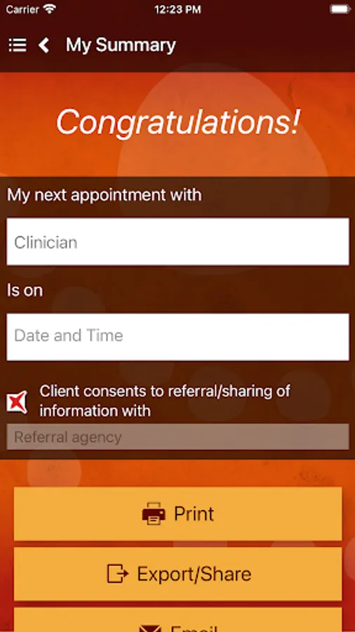 After navigating through all the pages, the client is taken to their Stay Strong Plan where a summary is provided and details of their next appointment can be entered. There is an option of emailing or sharing a text, pictorial or csv summary of the data entered.