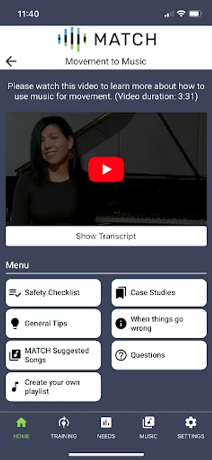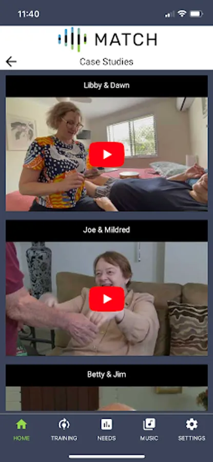 MATCH is an e-health app that helps users to learn to use music in an informed way to support people with dementia. Users complete training modules where they learn about how music impacts our brains and behaviours, and how different types of music and musical activities can be used to support people who are living with dementia.