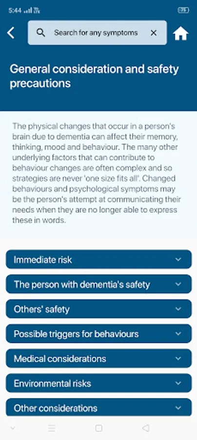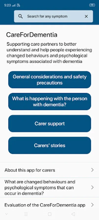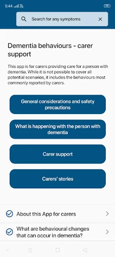 This App was developed to provide information and support for carers in their role of caring for persons with behavioural changes that can occur in dementia. Information on what these behaviours look like, why they might be happening and what you can do to help is included for those most commonly reported by carers. Understanding why behavioural changes are occurring can help to manage the behaviour. By downloading this App for carers you agree to the disclaimer below.