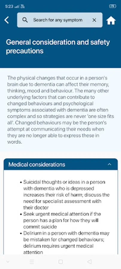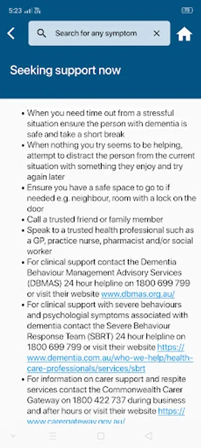 It is strongly recommended that those providing care to a person with dementia seek assessment and guidance from an appropriate health professional before implementing strategies suggested in this App. As a carer you should only apply information from this App subject to the advice you receive from health professionals, and subject to the ongoing provision of support by health professionals to those you care for.