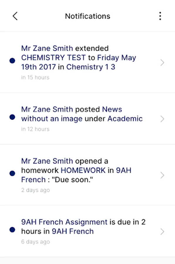 Calendar: the Calendar provides parents, teachers and students a personalised view of what's coming up for the day or in the future. Students can also receive reminders when the due date for their work is approaching