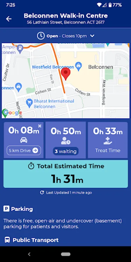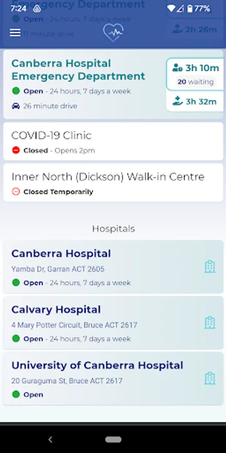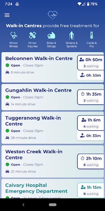 The ACT Health app provides detailed hospital emergency department and walk-in centre wait times, treatment times as well as travel times and directions to the nearest health facility.