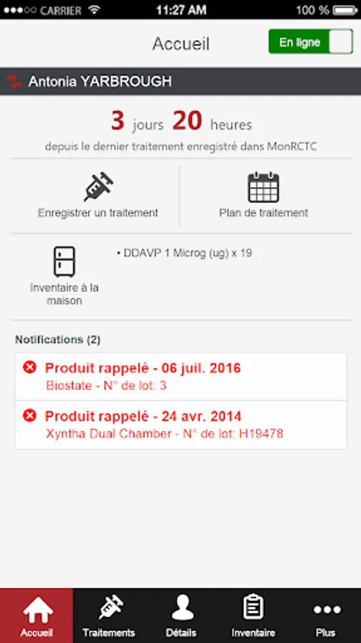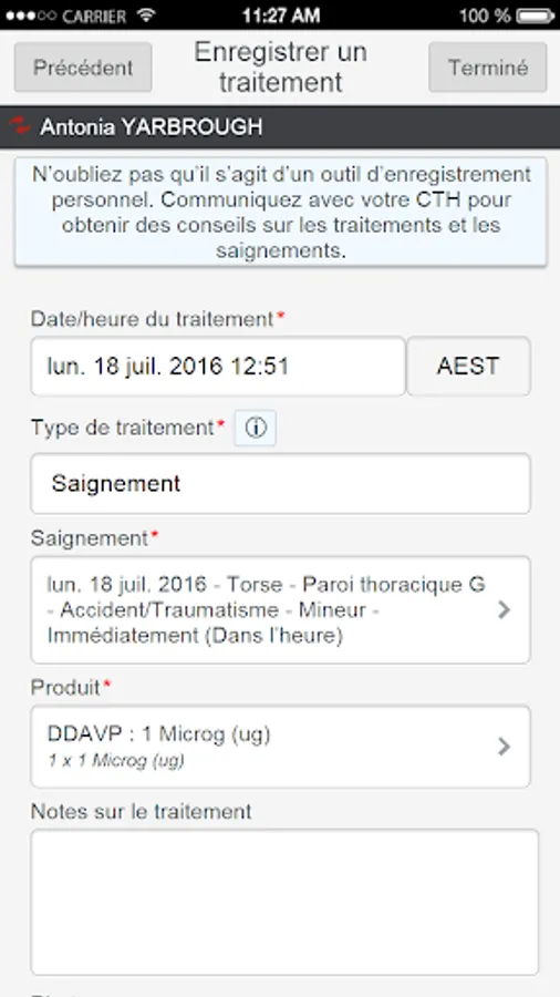 MonRCTC is a secure application for people with bleeding disorders or parents / guardians to save the home treatments.