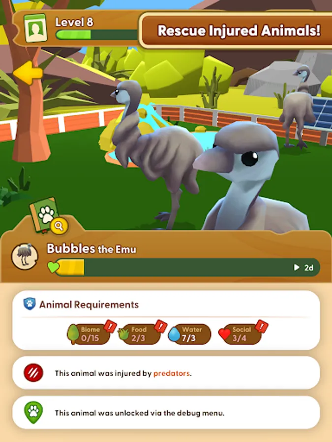 You are an Australian park ranger in training, your job is to explore the great outdoors to rescue injured native animals and discover local flora. Nurture and care for the animals, manage their happiness and health by taking the time to understand their needs. It's up to you to use your newfound knowledge to construct the perfect habitat for their rehabilitation. Build your own, unique wildlife sanctuary where you nurse all the animals back to full health and once they are healthy, you release them back into the wild.
