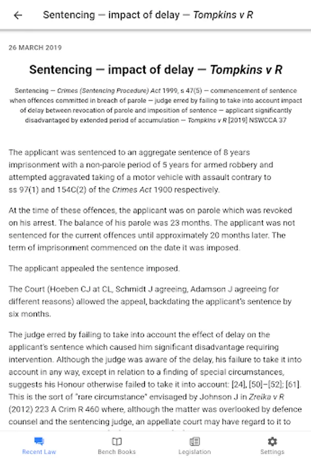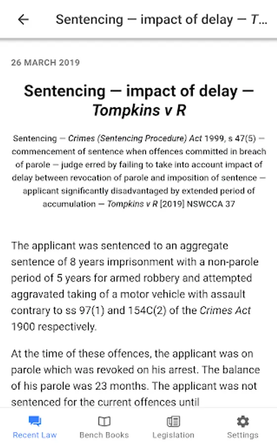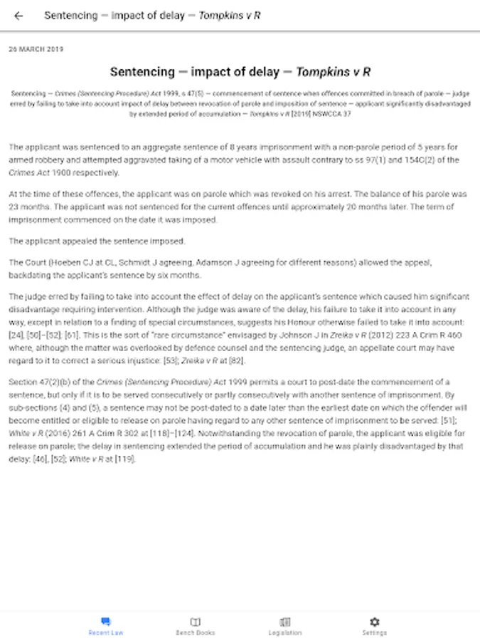 This app is designed to be of use for judicial officers, lawyers and police prosecutors, as well as law students from New South Wales, particularly when working in locations where there is limited internet access available.
