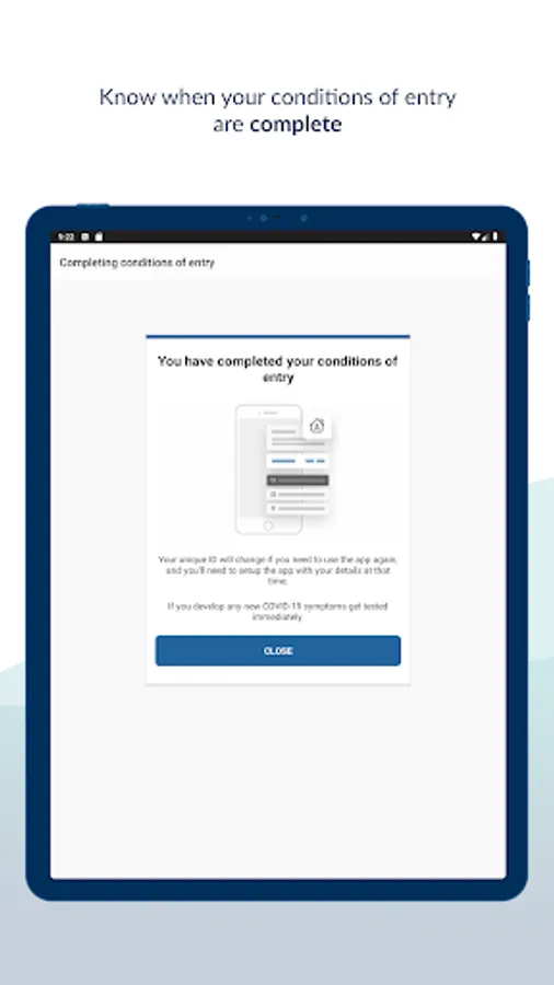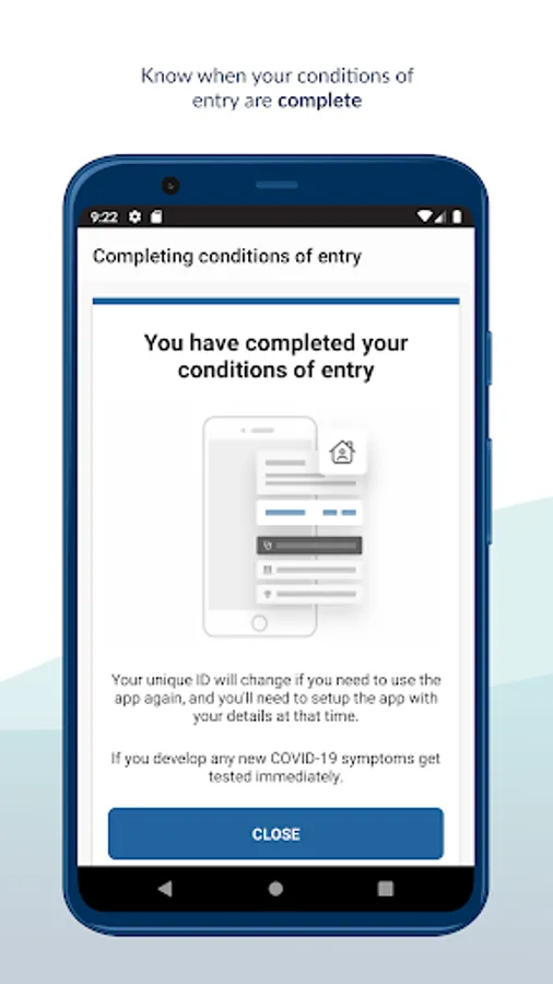 - Schedule of required symptom checks and COVID-19 tests to help plan and manage your conditions of entry.