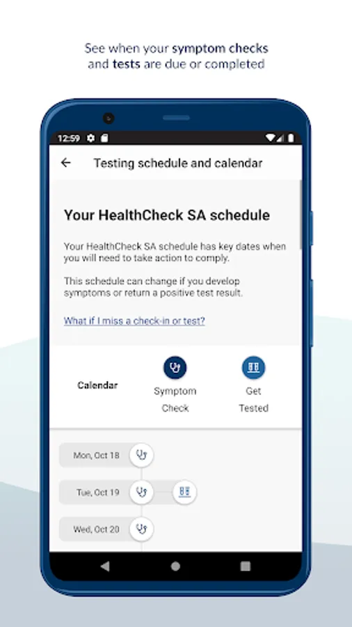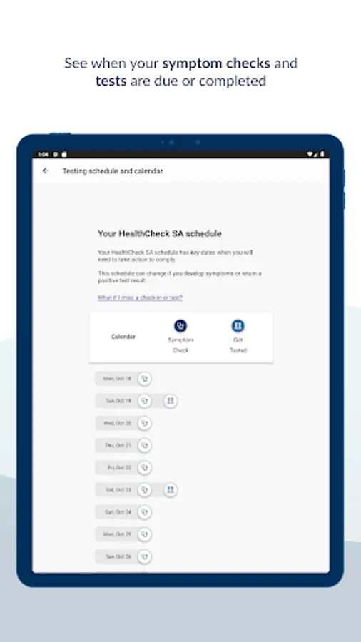 - Scheduled COVID-19 test reminders and indication of tests taken.
